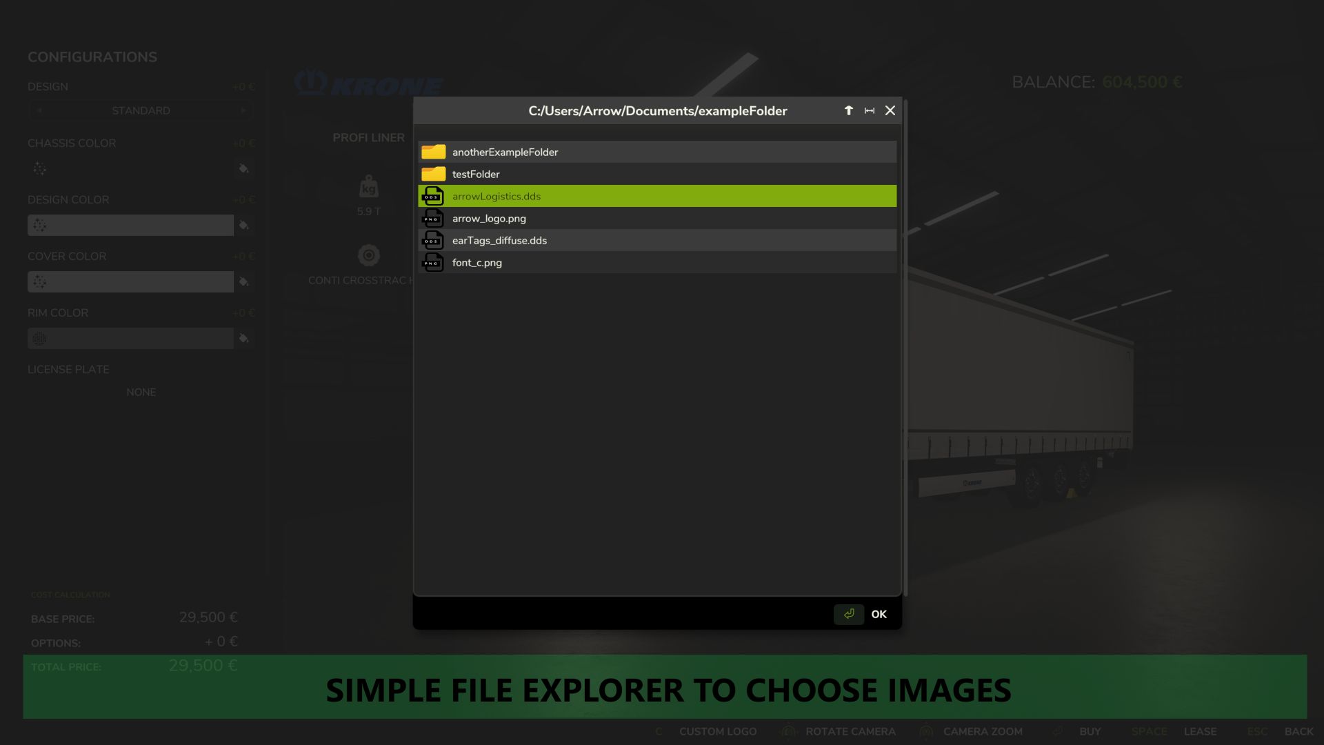 This mod allows you to put a custom image onto any vehicle using a simple custom in-game file explorer when buying a new vehicle at the shop or modifying an existing vehicle, in order to put your own logo on your vehicles. Images can be moved, scaled, rotated and mirrored accordingly.