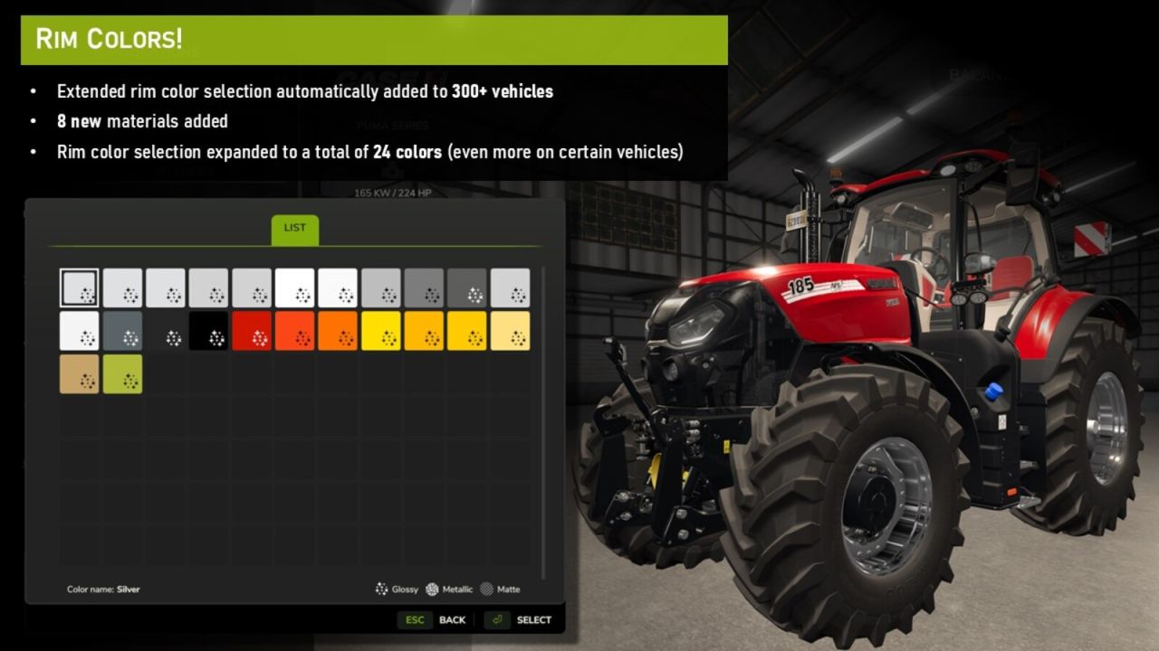It is possible to use any of the colors defined by this mod in your own mods. You can reference the color by its template name (e.g. “PITCH_BLACK” or “RIM_ALUMINUM_POLISHED”), just remember to add this mod as a dependency in modDesc to avoid warnings in the log.