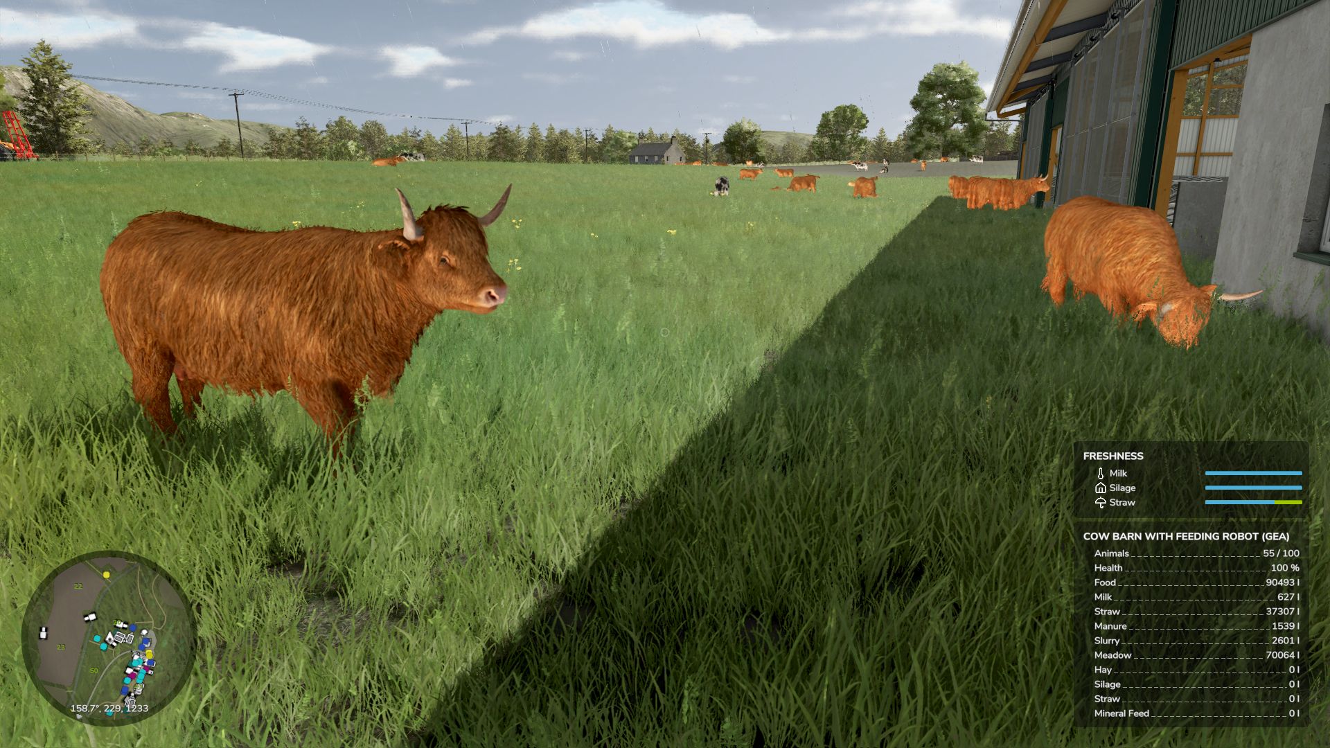 – Age distribution bars when near placeables, vehicles, and bales (color-coded freshness)