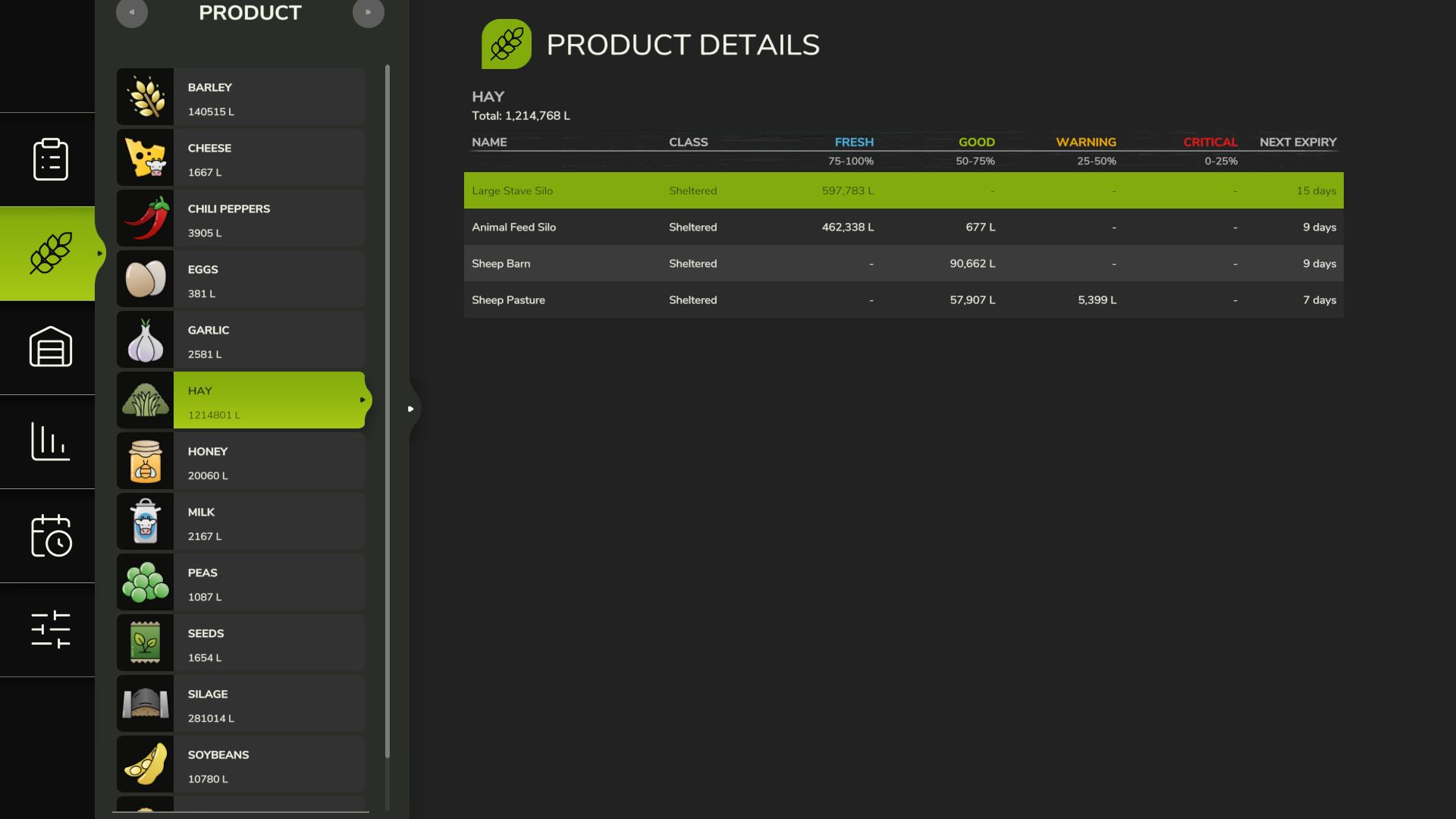Install the mod and play normally. Open Fresh Menu with Right Shift+F to view inventory, stats, and settings. Check expiry by looking at any vehicle, bale, or storage. Customize shelf lives in Settings if defaults don’t suit your playstyle.
