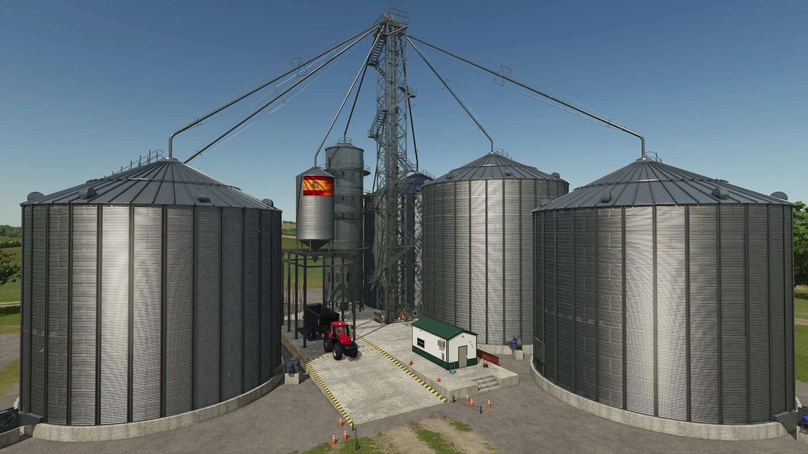 Large grain silo with 16 million liter capacity. Stores standard grains as well as green beans and peas