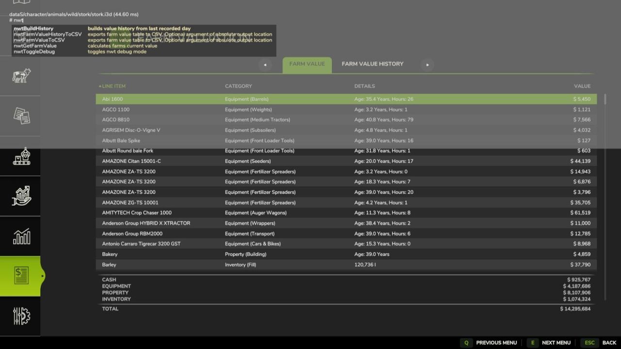– Adds console commands `nwtBuildHistory`, `nwtToggleDebug`, `nwtGetFarmValue`, `nwtFarmValueToCSV`, `nwtFarmValueHistoryToCSV`