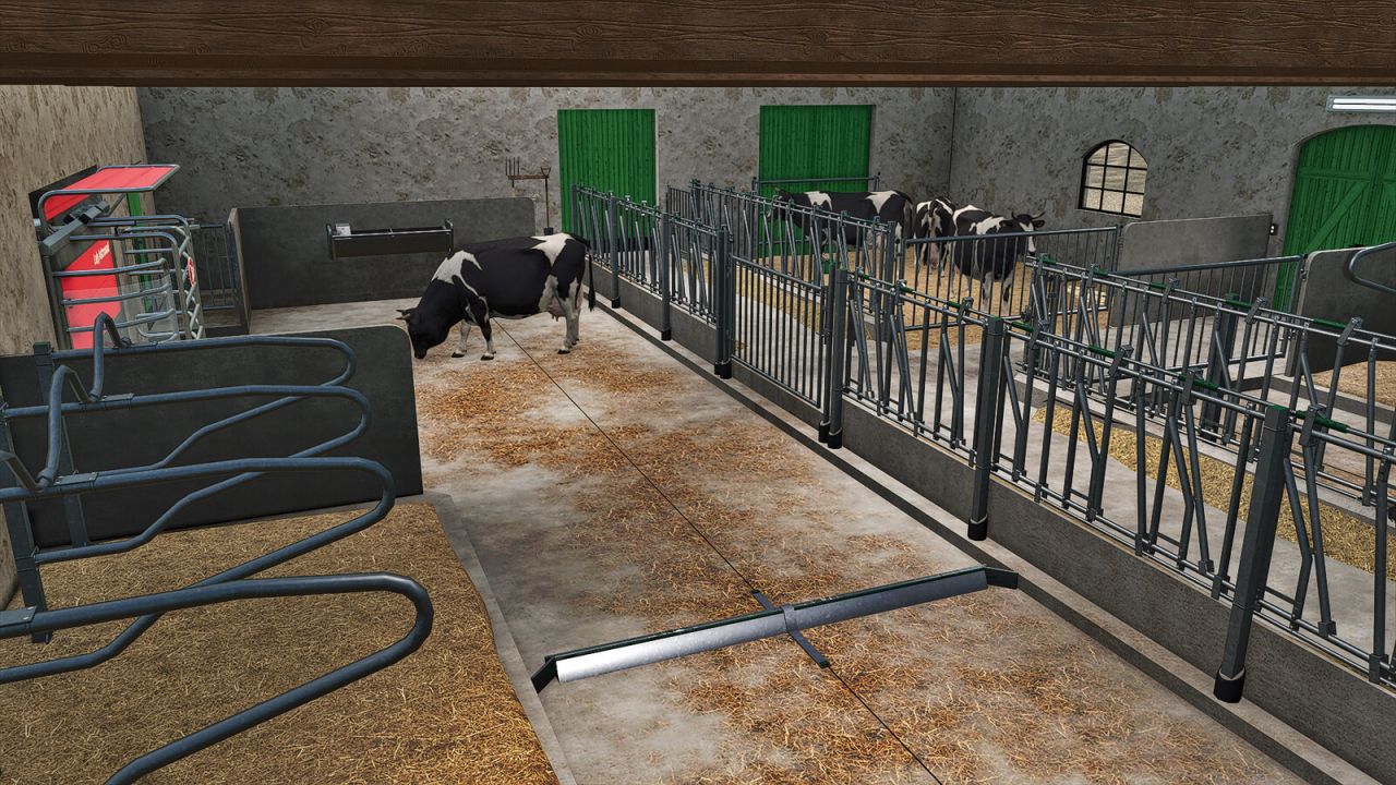 There are two versions of the building: one with a pasture and one without. In addition, there are many configurations, such as three different types of exterior walls: stone, brick, and plaster. Green or black doors and color selection for the upper walls. It’s also possible to choose the brand of the milking robot.