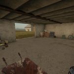 Buildings constructed of grey cinder blocks.