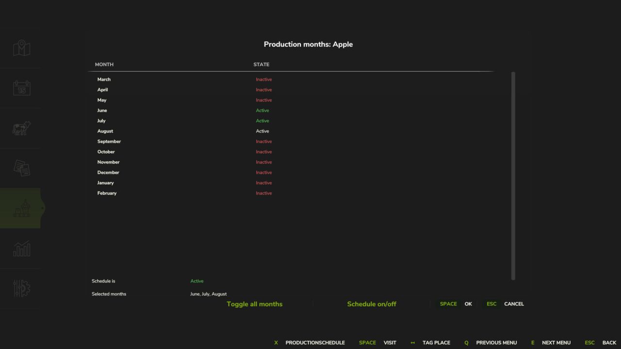 Allows you to specify the months in which each individual production in a production facility should be active.