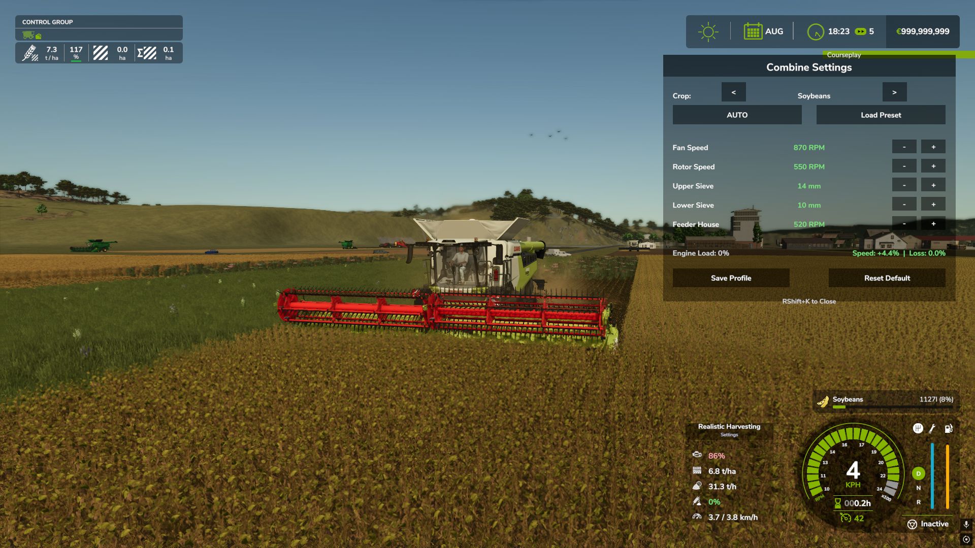 ⚙️ Interactive Combine Calibration (NEW): Press `RShift + K` to open the Combine Settings menu! You must calibrate your Fan, Rotor, Sieves, and Feeder for each specific crop type. Poor settings will result in additional crop loss!