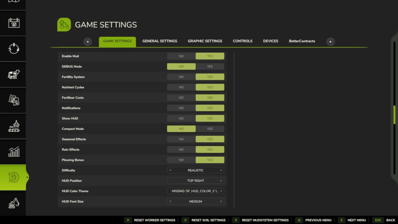 All settings are in-game under Soil & Fertilizer in the game menu. In multiplayer, gameplay settings are admin-controlled. HUD/display settings are always per-player.
