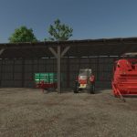 A wooden shelter with sheet metal for machines and everything that needs to be kept under the roof.