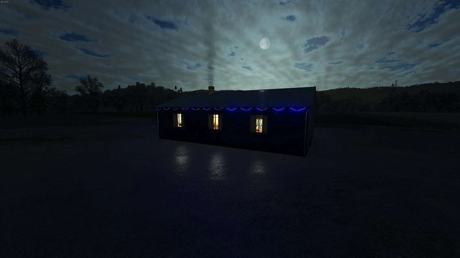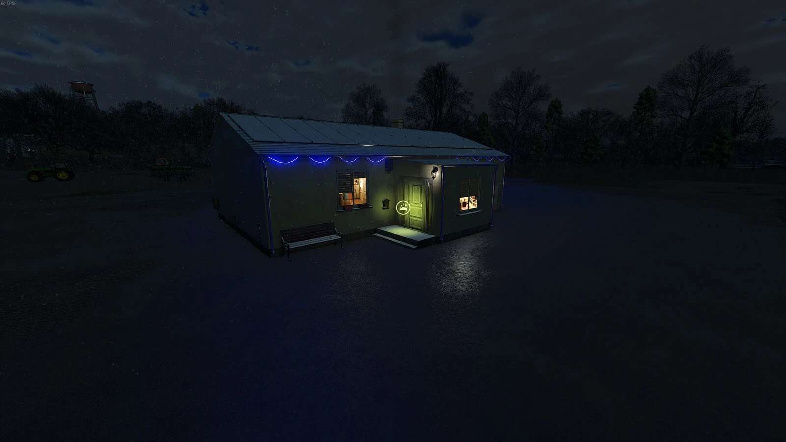 Small single-family home with sleeping function, Christmas lights and solar panel setup.