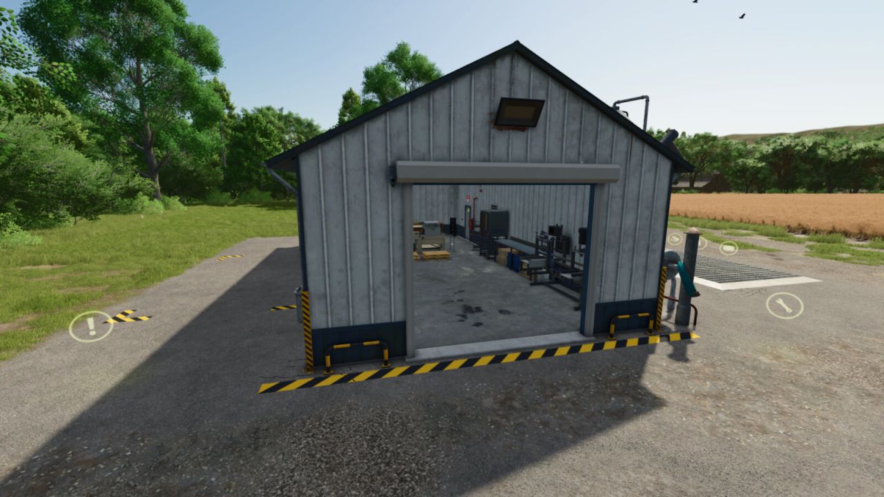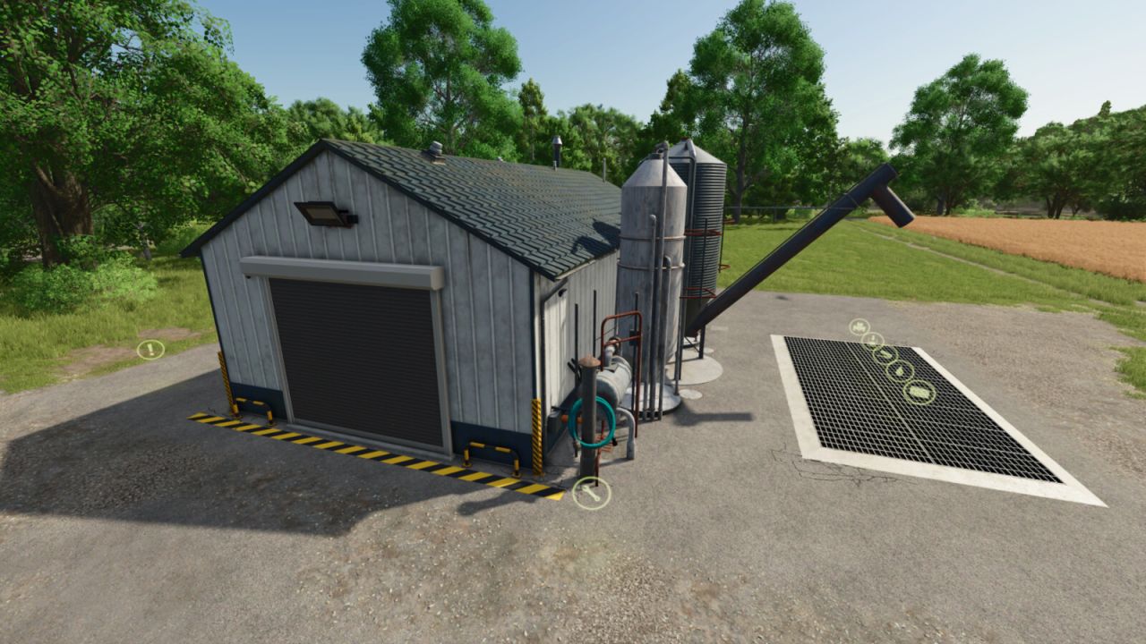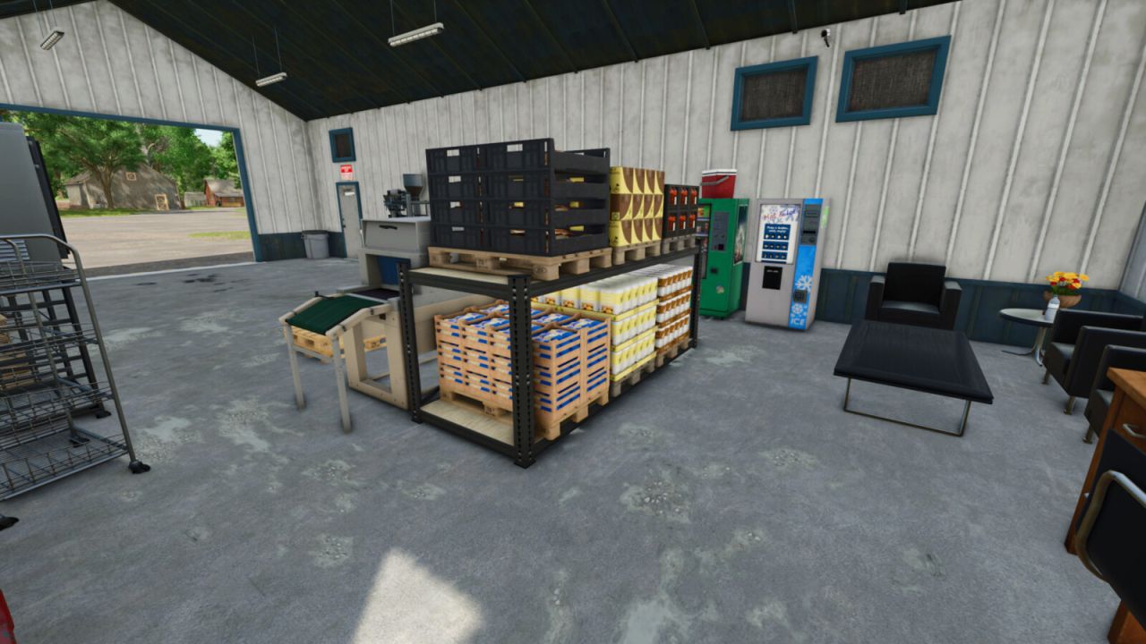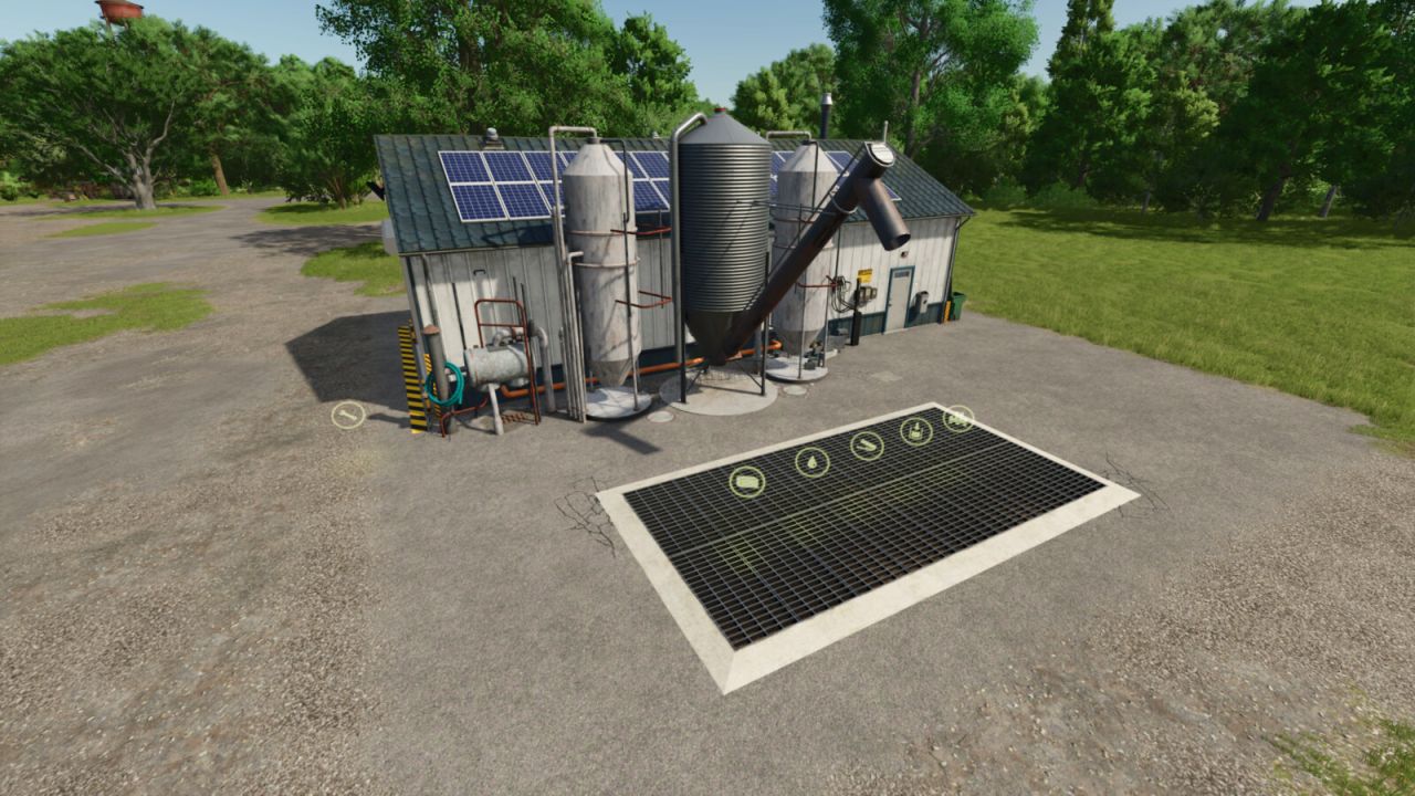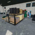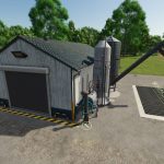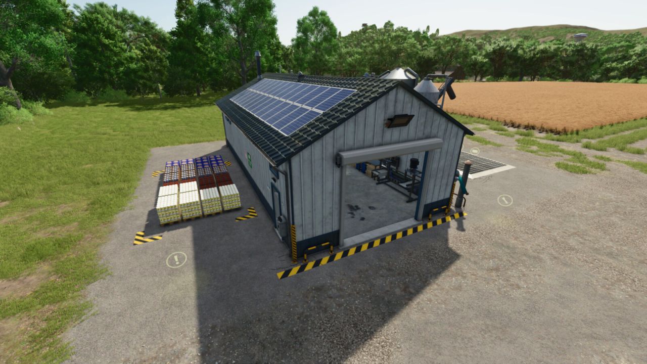 This is a production that has an internal storage for up to 2000 pallets. It will do 49 of the base game recipes, including a few from my other production mods. Once the production is actively making products, they will be spawned directly into the internal storage until you are ready for them. There is an unload and load area for both bulk material as well as pallets/bales to be stored. Bulk material can be stored and removed acting like a silo storage. There is a trigger next to the pallet spawn area to select what pallets to spawn and bulk material comes out of the silo pipe. When placing, there is an option for solar panels with a monthly ($720 monthly) income or no monthly income if you just like the look but don’t want the extra money. Bring whole trees or logs to the front of the building to process into wood chips for further processing.