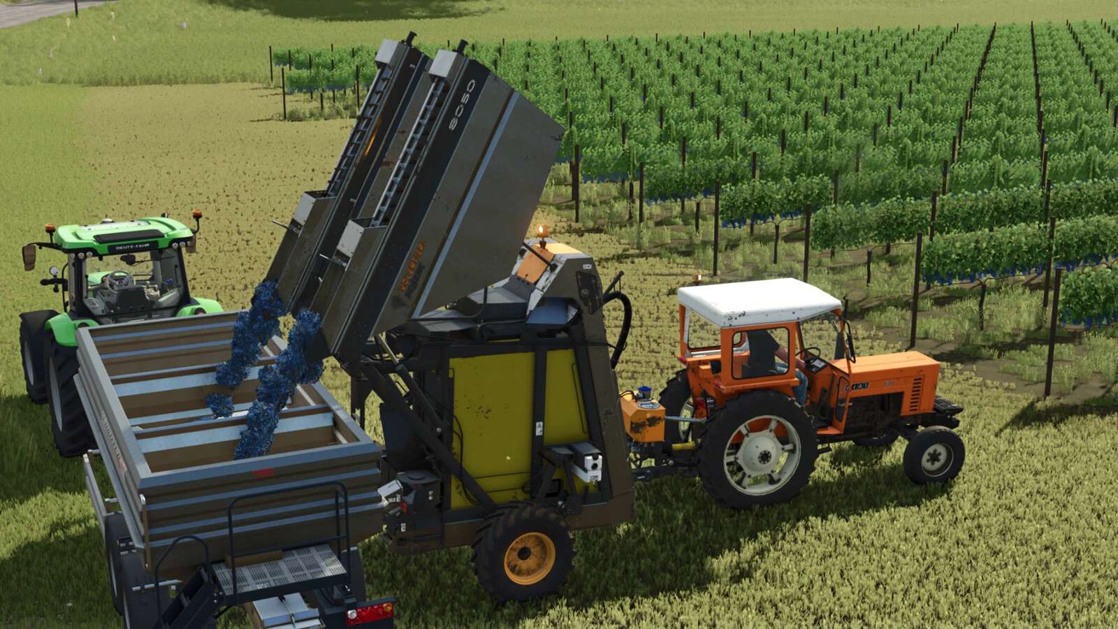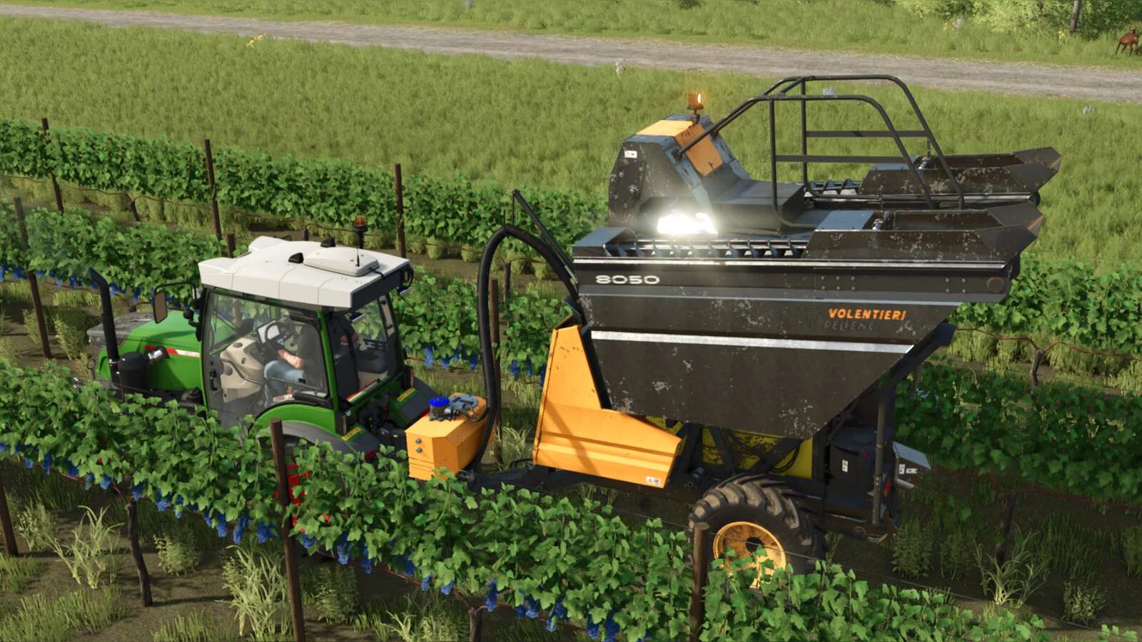 The 8050 trailed harvester with EASY SMART harvesting head allows the operator to simply and instantly record from the driver’s seat all shaking parameters to best adjust the machine on the vineyard.